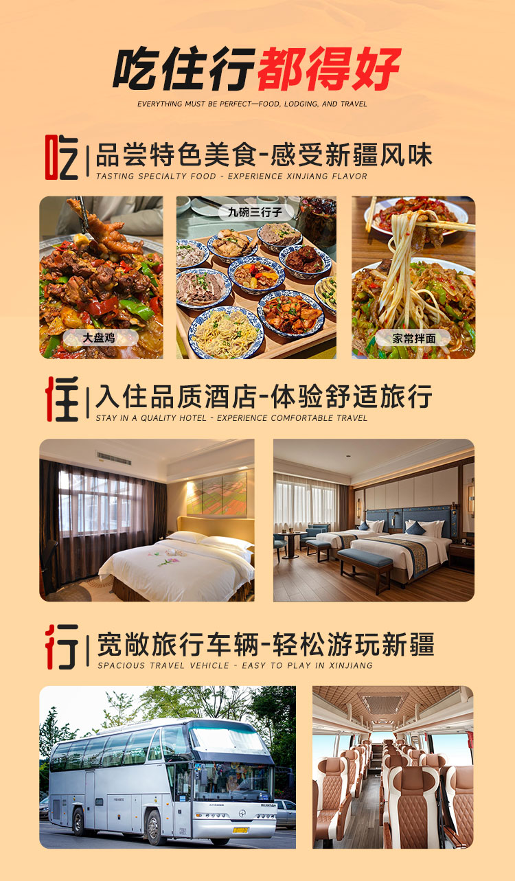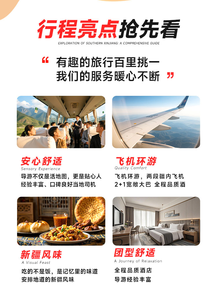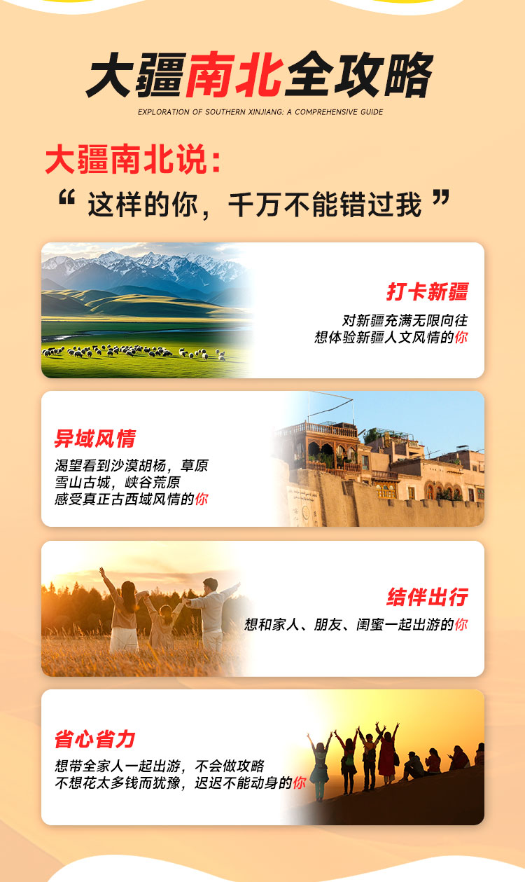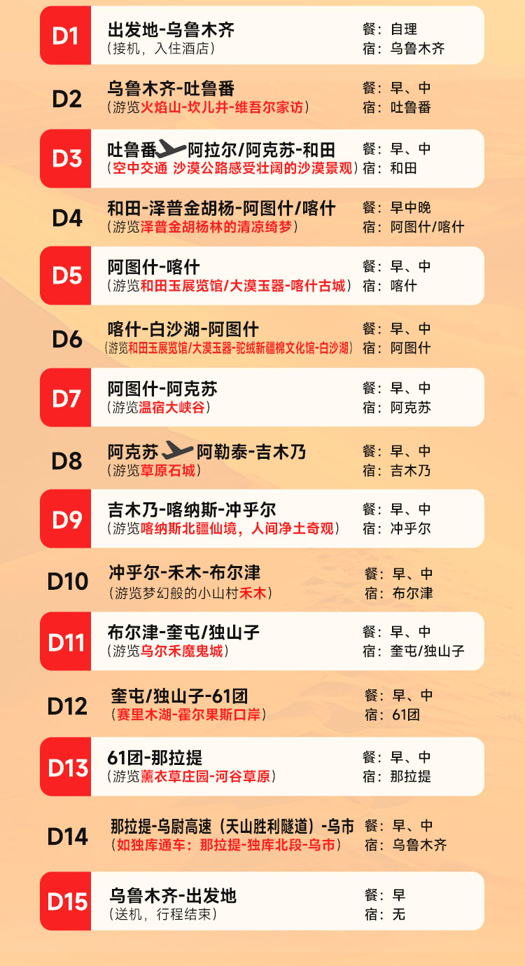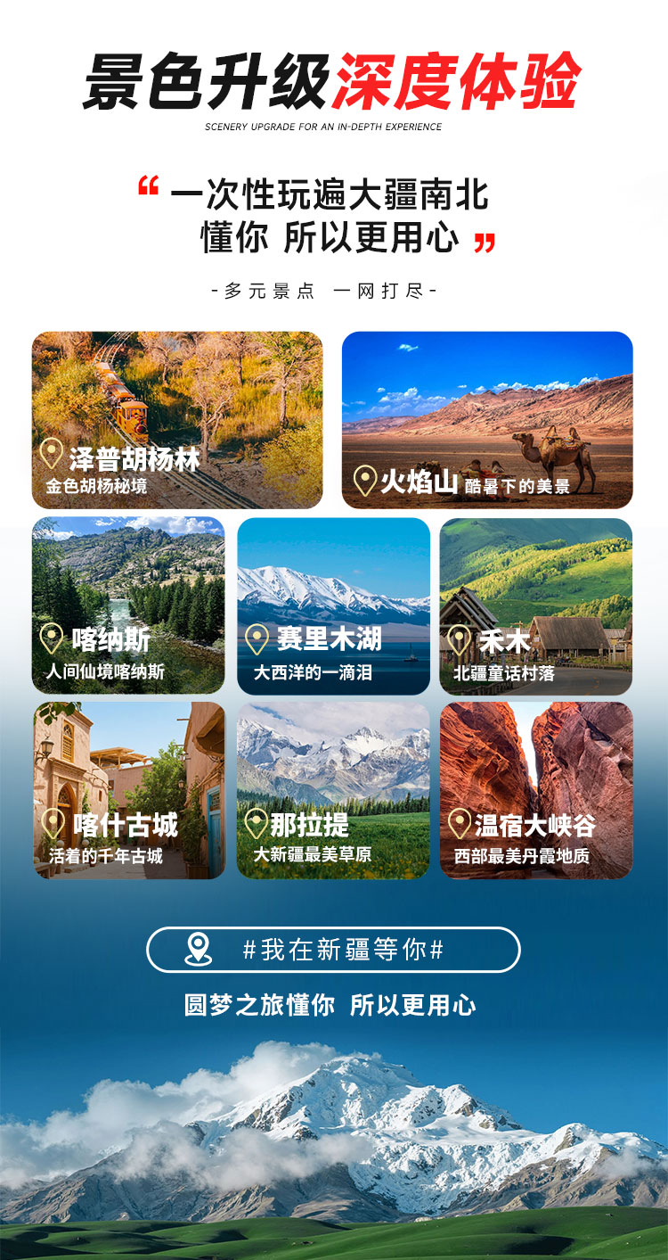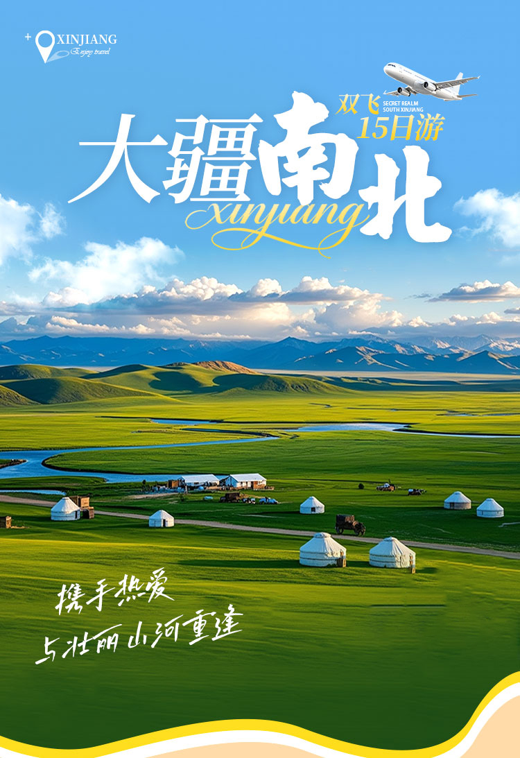 【大疆南北 15 日双飞全景游】疆内双飞省程高效,串联 12 大核心景点,尽览北疆自然壮阔与南疆人文厚重,以舒适服务解锁新疆四季多元魅力与地道风情。