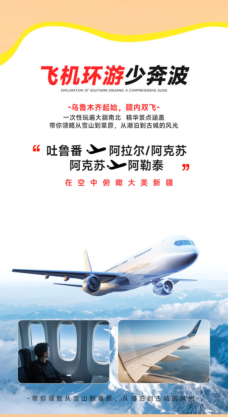 1、【升级疆内飞机】:乌鲁木齐起始,疆内双飞,一次性玩遍大疆南北,精华景点涵盖,带你领略从雪山到草原,从湖泊到古城的风光。
