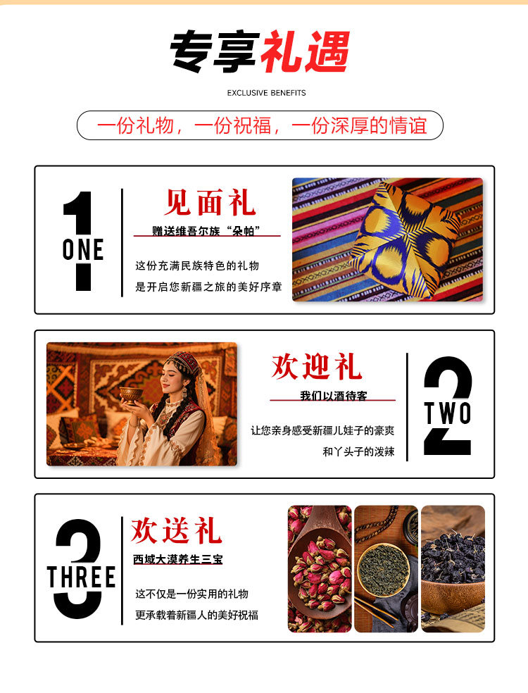 欢送礼:旅程结束时,赠送西域养生三宝,这不仅是一份实用的礼物,更承载着新疆人的美好祝福,让您把新疆的温暖与关怀带回家。