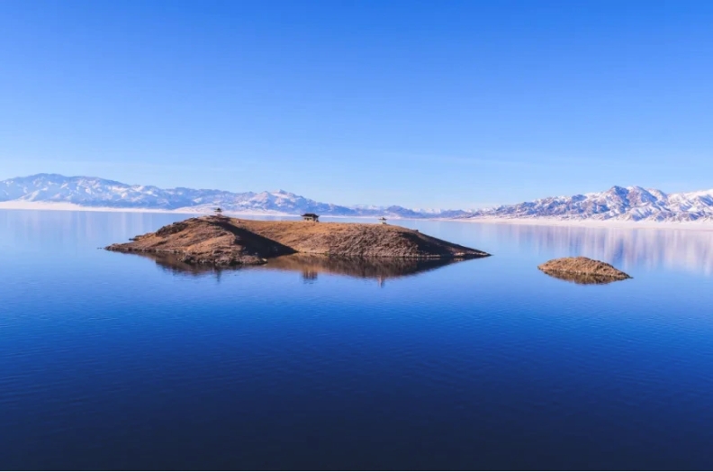 赛里木湖湖心岛上,屹立着一座吟诗亭。